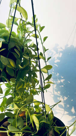 Beautiful houseplant in pot hanging on the window with sunlight.