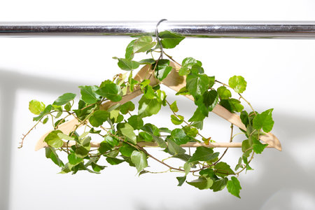 Clothes hanger entwined with green plant hanging on plain on white wall.