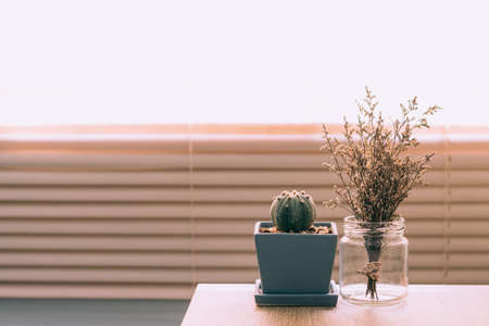 Cactus in ceramic pot and dried flowers in glass bottle near the window. Vintage tone color.
