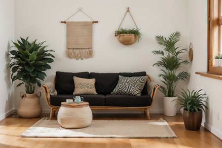 Warm and cozy ethno living room interior with couch, patterned pillows, plants i flowerpots, fern, rattan sideboard, basket on wall, wooden bowl and personal accessories. Home decor. Template.