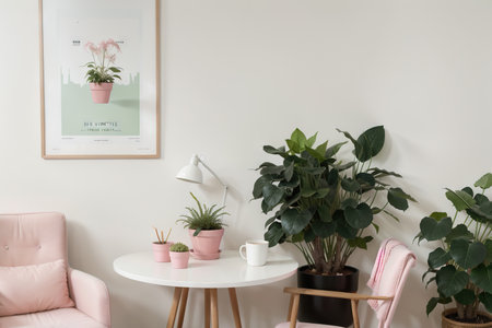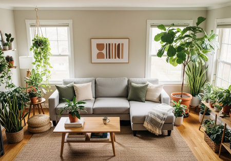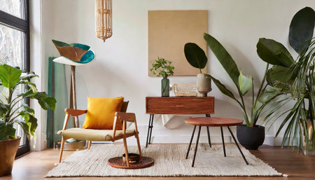Natural living room interior with green plants and wooden furniture for warm home decor