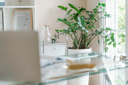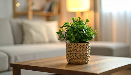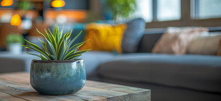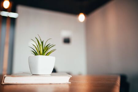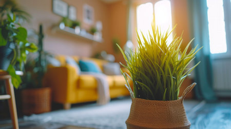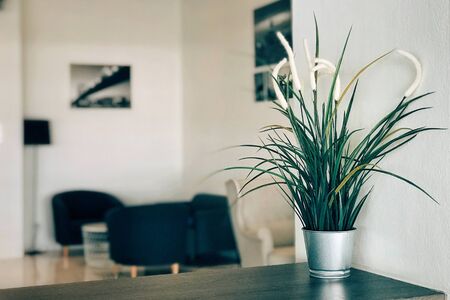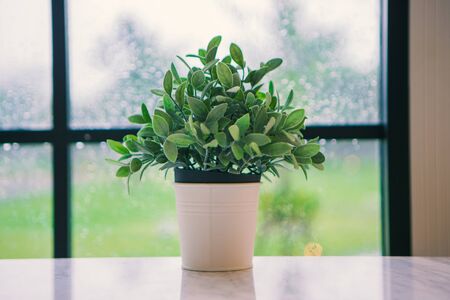 artificial plant in ceramic pot as a room decor with bokeh background. plants are friends