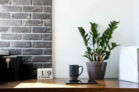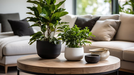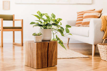 Close up of stylish brown wooden square with beautiful plants in white pots at modern interior of living room with design furnitures and accessories. Bright and sunny home space. Home decor. Template.