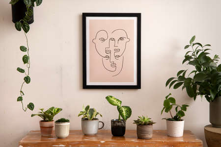 Stylish interior design of living room with wooden retro commode, chair, tropical plant in rattan, basket and elegant personal accessories. Mock up poster frame on the wall. Template. Home decor.