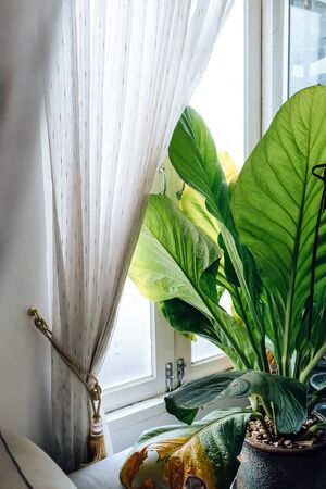 Succulents on the windowsill in the apartment, house cleanliness concept