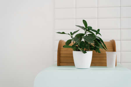 A houseplant in a white pot is in the house. The interior of the room in the Scandinavian style