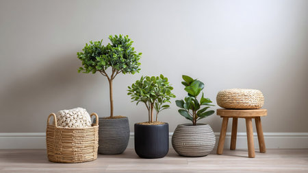 Group of indoor artificial plants with minimalist gray and black planters placed on a light wood floor, accompanied by a wicker basket and a small crochet stool, evoking organic Japan calm.