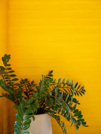 Green leaves. plant in big concrete pot at the room corner on yellow wood plank wall background with copy space, vertical style.