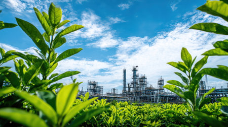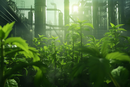 Green plants in the foreground with an industrial structure in the background, highlighting the contrast between nature and industry