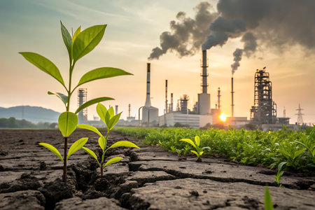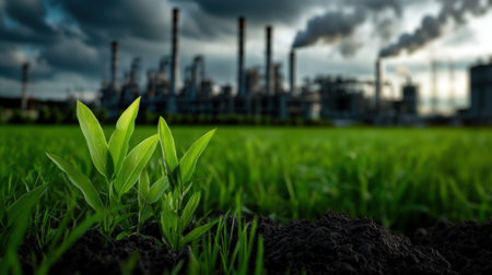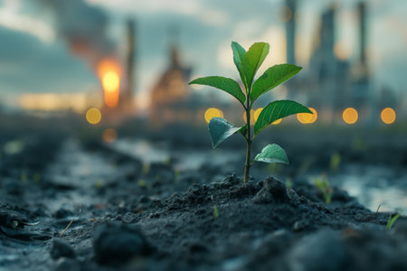 A solitary green plant emerges from the dark soil, symbolizing resilience against industrial pollution in the background. The image highlights the contrast between nature and industry.