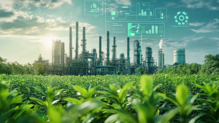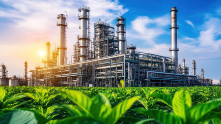 Industrial refinery behind lush green crops under a bright, cloudy sky