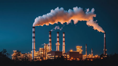 A breathtaking view of an industrial power plant at night, showcasing tall smokestacks emitting white smoke against a dark blue sky, illuminating the surrounding landscape.
