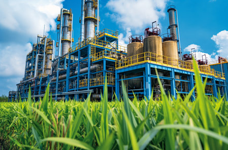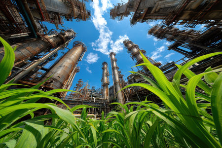 A stunning low angle perspective showcasing towering industrial structures against a vibrant blue sky, surrounded by lush green blades of grass that highlight the contrast between nature and technology.