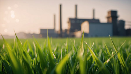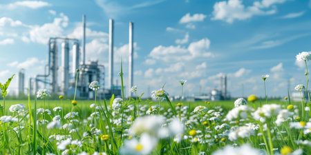 A green grass field juxtaposed against a backdrop of industrial structures, symbolizing the intersection of nature and industry, with an eco-friendly theme.