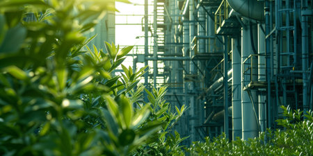 A sharp contrast between the fresh green plant leaves and the complex structures of an industrial plant