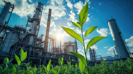 A green sprout grows out of the ground against the background of an oil and gas processing plant. concern for the environment.