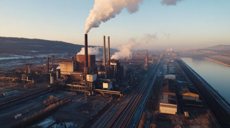 View from above: Industrial factory emitting gray smoke from chimney pipes causing air pollution. Concept Industrial Pollution, Environmental Impact, Factory Emissions, Air Quality, Global Warming