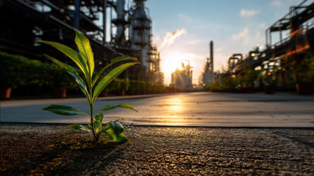A small plant emerges from the ground in an industrial area, standing out against factories and smoke stacks as the sun sets, illustrating nature's strength in a man-made environment