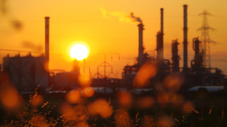 Dark smoke rises from tall chimneys of an industrial facility as the sun sets, casting an orange glow against the cloudy sky.