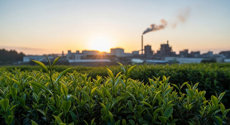 Tea plants grow lush and green near an industrial site, showcasing a mix of nature and industry under a bright sky.