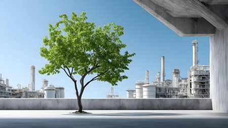Industrial scene with a mix of machinery and a green plant thriving under a bright blue sky, symbolizing balance.