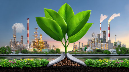 Bright green leaves thriving in the foreground sharply contrast with a blurred industrial oil refinery, highlighting the potential for environmental recovery and sustainability