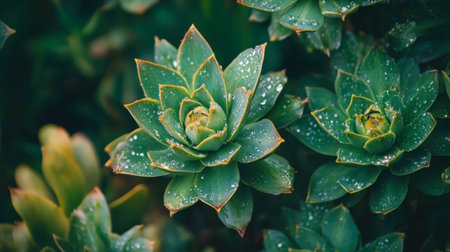 Lush close-up of vibrant green succulent plants adorned with water droplets, showcasing their unique texture and natural beauty in a serene garden environment.