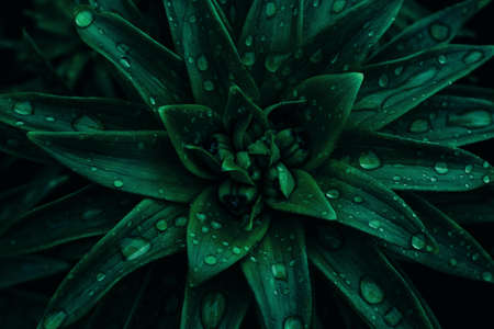 Close-up nature view of green leaf texture, dark wallpaper concept, nature background. Dark green leaf background with water droplet. Photo concept nature and plant. Selective focus.