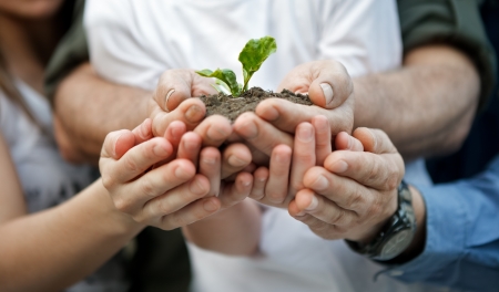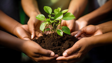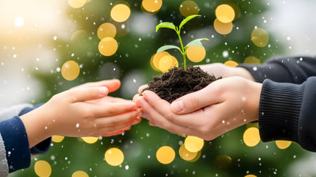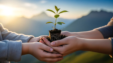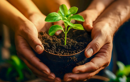 Connecting with Nature and Family. Hands nurturing a small plant together, emphasizing eco-friendly gardening.