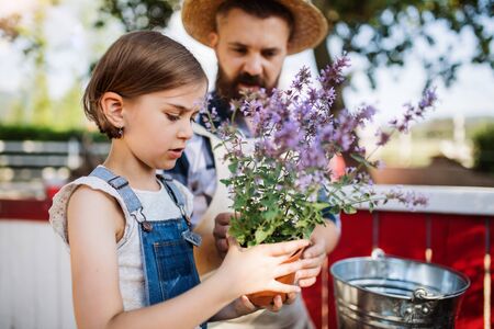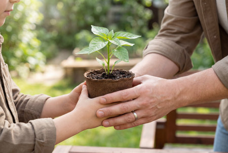 Close up view of adult male hands passing a small pot with a green young plant to child hands in a sunny outdoor garden environment emphasizing care and nature conservation.