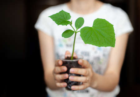 The girl is holding a black pot with a green plant on a dark background. Seedlings of cucumbers in a pot, ready for planting in the ground. Environmental protection. Respect for nature