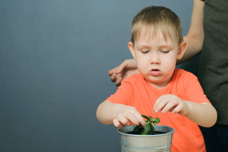 caucasian mothers hands and blond son kid boy planting money tree plant or crassula ovata in metal flower pot, indoor gardening, stock photo image