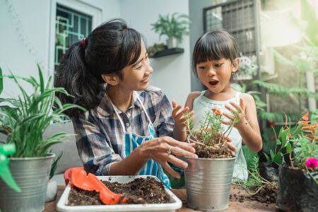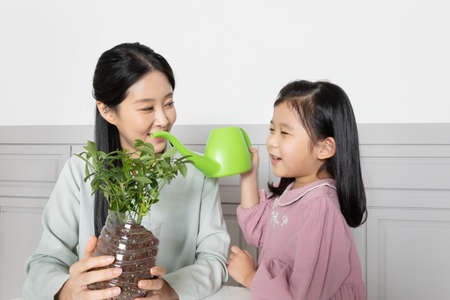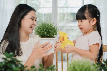 Happy cheerful Asian family mom and daughter watering plant in gardening near window at house. Self-isolation, stay at home, social distancing, quarantine for virus prevention.