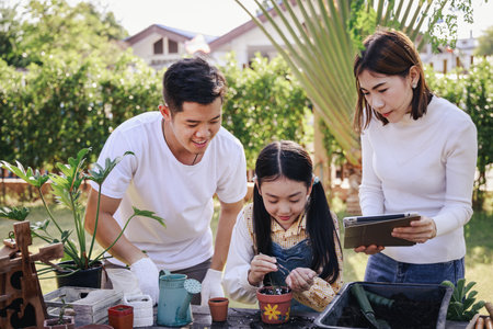 Asian Father, Mother, and pretty daughter helping planting together for planting trees by watching method in internet by tablet at home garden. Happy and enjoy family outdoor activity in holiday.