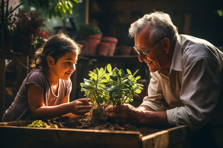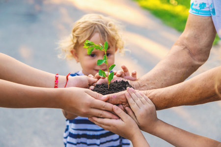 Elderly hands pass a young plant to a child's hand, highlighting the connection between generations and nurturing the future of nature.