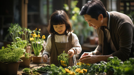 Parenting and Plant Care. A family together planting and nurturing greenery in their home.