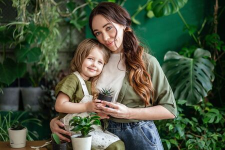 Young woman with her children taking care of plants indoors. Family home gardening hobby concept.