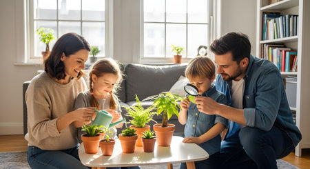A happy family engages in indoor gardening in their bright living room. The mother and daughter are watering small potted plants, while the father watches his son inspect a leaf with a magnifying glass. This educational activity fosters a love for nature and science in a comfortable home environment.