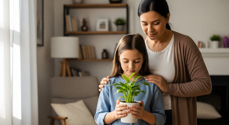 A smiling mother stands behind her young daughter, both gently holding a green potted plant in a bright living room. The image symbolizes growth, nurturing, environmental education, and a strong family bond.