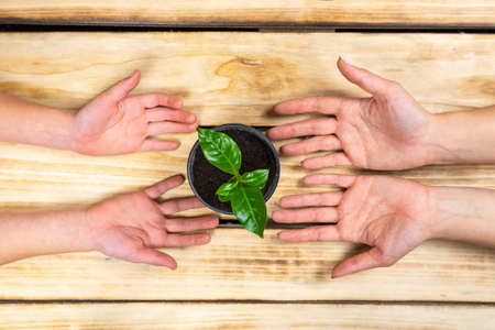 Childrens hands and female hands near a young green coffee tree on a background of wooden boards.