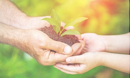 Grandmother and child hold a tree sprout in their hands. Selective focus. Nature.