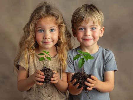 A young girl and boy smiling while holding seedlings, promoting environmental care and planting.