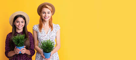 Mother and daughter kid banner, copy space, isolated background. mother and daughter smile with plant in pot on yellow background.