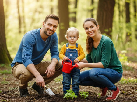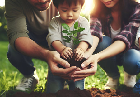 Family planting a tree together, symbolizing human effort to combat climate change and promote reforestation.
