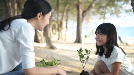 Asian child girl and her mother holding young seedling in the flowerpot together for prepare planting on ground as environmental conservation and save world concept