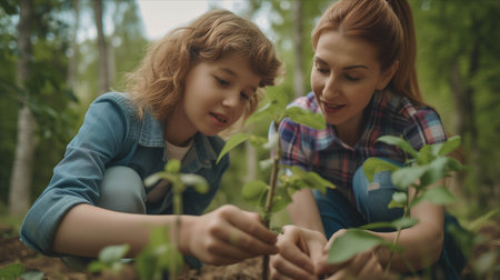Family Bonding and Sustainable Gardening. A mother teaches her daughter about nurturing a plant.