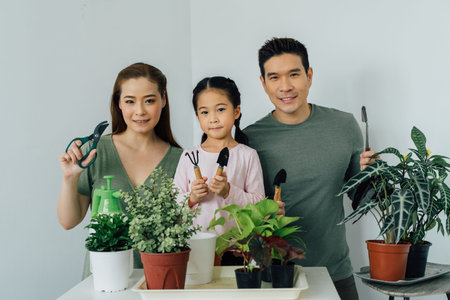 Asian mother and father looking at camera with young daughter holding gardening tools and looking after plants. Happy family bonding activity concept.