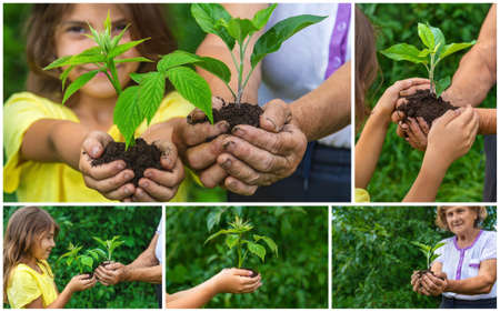 The grandmother and the child are holding a plant sprout in their hands. Selective focus. Nature.