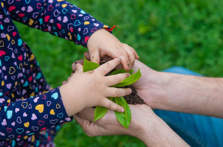 Children watch plant trees, hold in their hands. Selective focus. Kids.