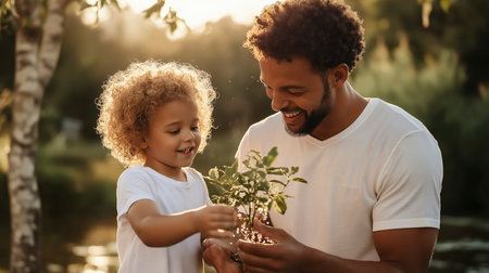 Father and daughter share a joyful moment planting a tree by the serene lakeside during golden hour. Generative AI